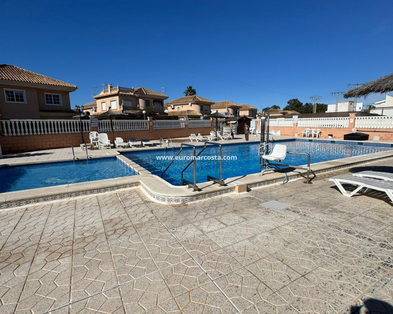 Der Bungalow ist Teil einer Anlage mit Gemeinschaftspool, perfekt zum Abkühlen im Sommer. Der Flughafen Alicante-Elche ist ca. 50 km entfernt (45–55 Autominuten) und somit ideal für nationale und internationale Reisen.