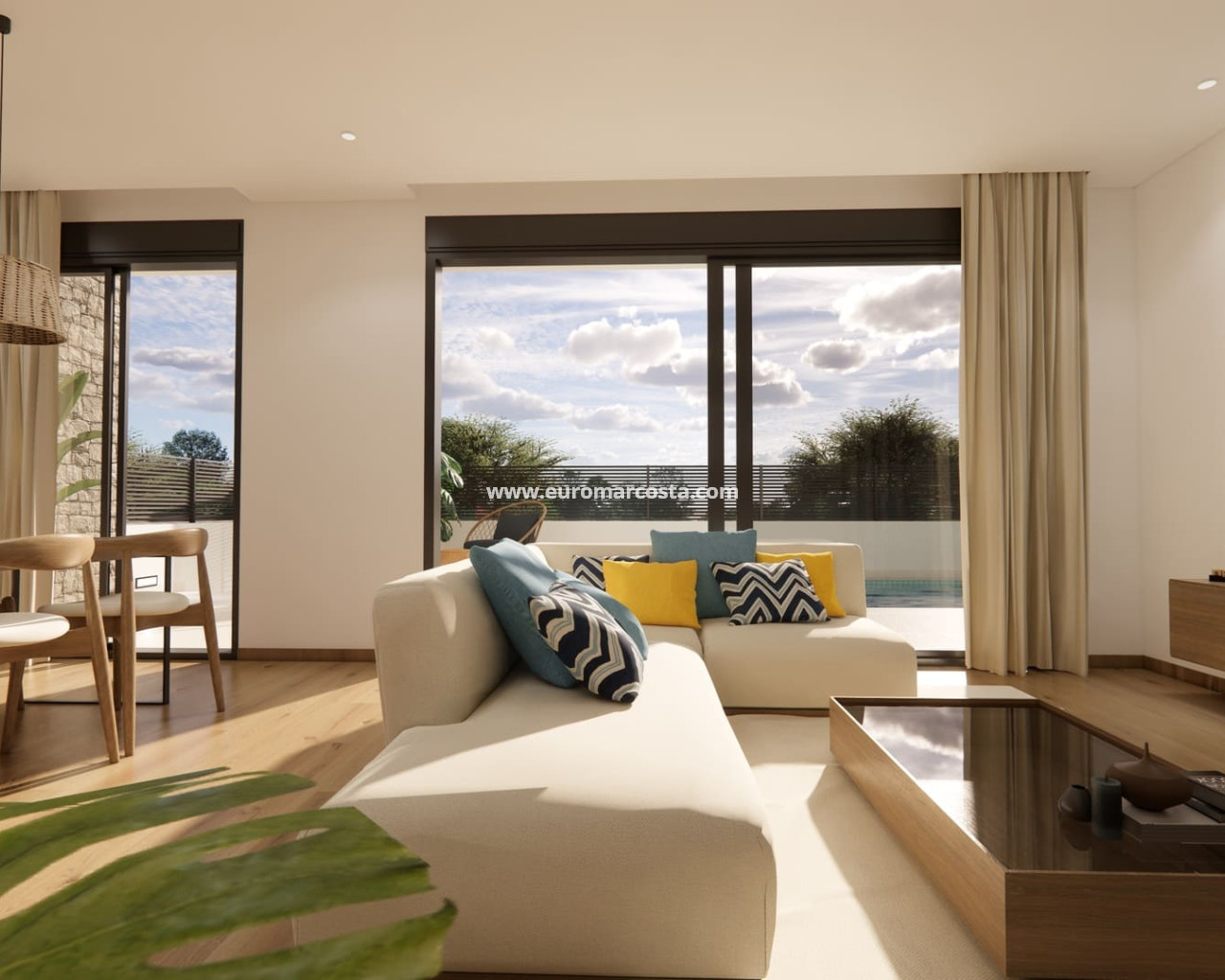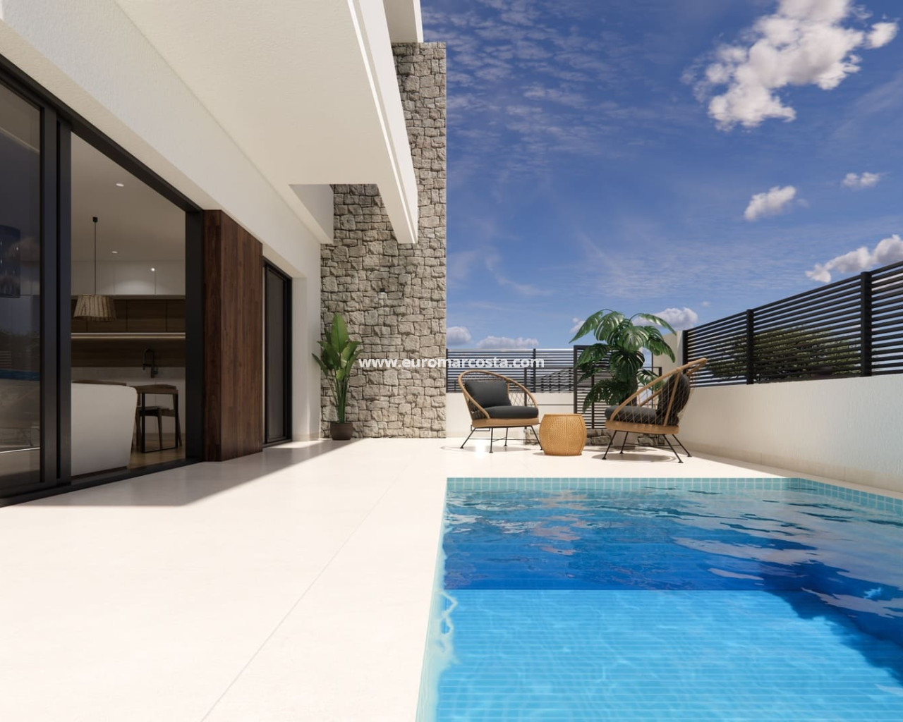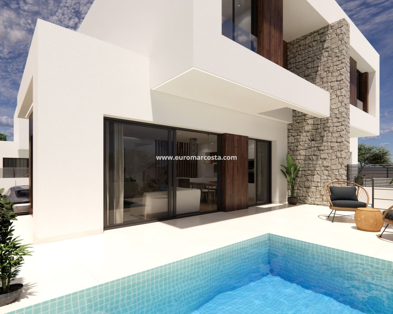 The exterior design of these semi-detached villas combines modernity and functionality, with a minimalist aesthetic that blends harmoniously into the peaceful surroundings of Dolores. Each property has its own plot of 155 m², with a private garden, swimming pool and a 36 m² terrace to enjoy the Mediterranean climate in the open air. The facades are finished in light tones that reflect the natural light and enhance the contemporary style of the development. In addition, each villa has a private parking space, providing security and convenience in accessing the property.