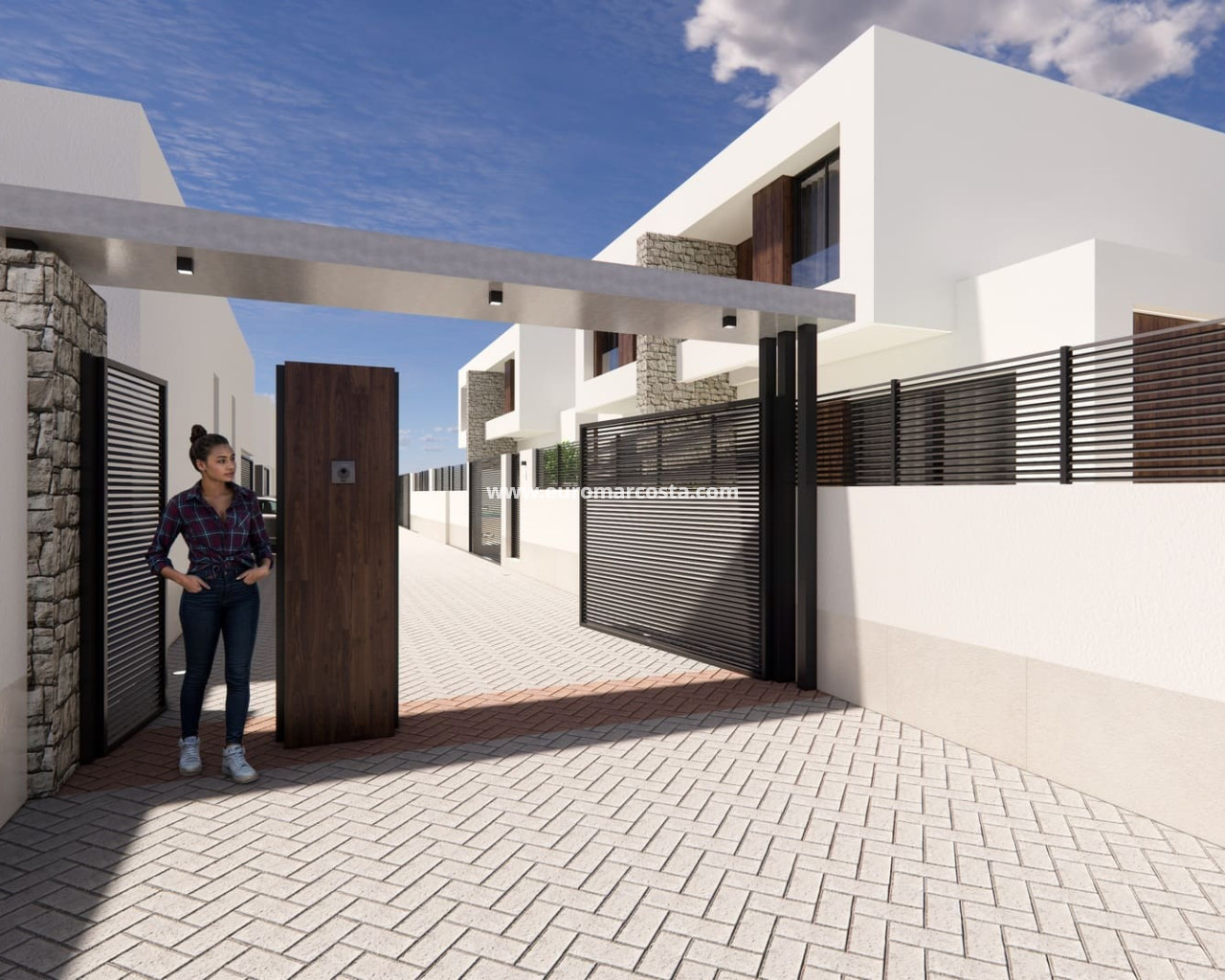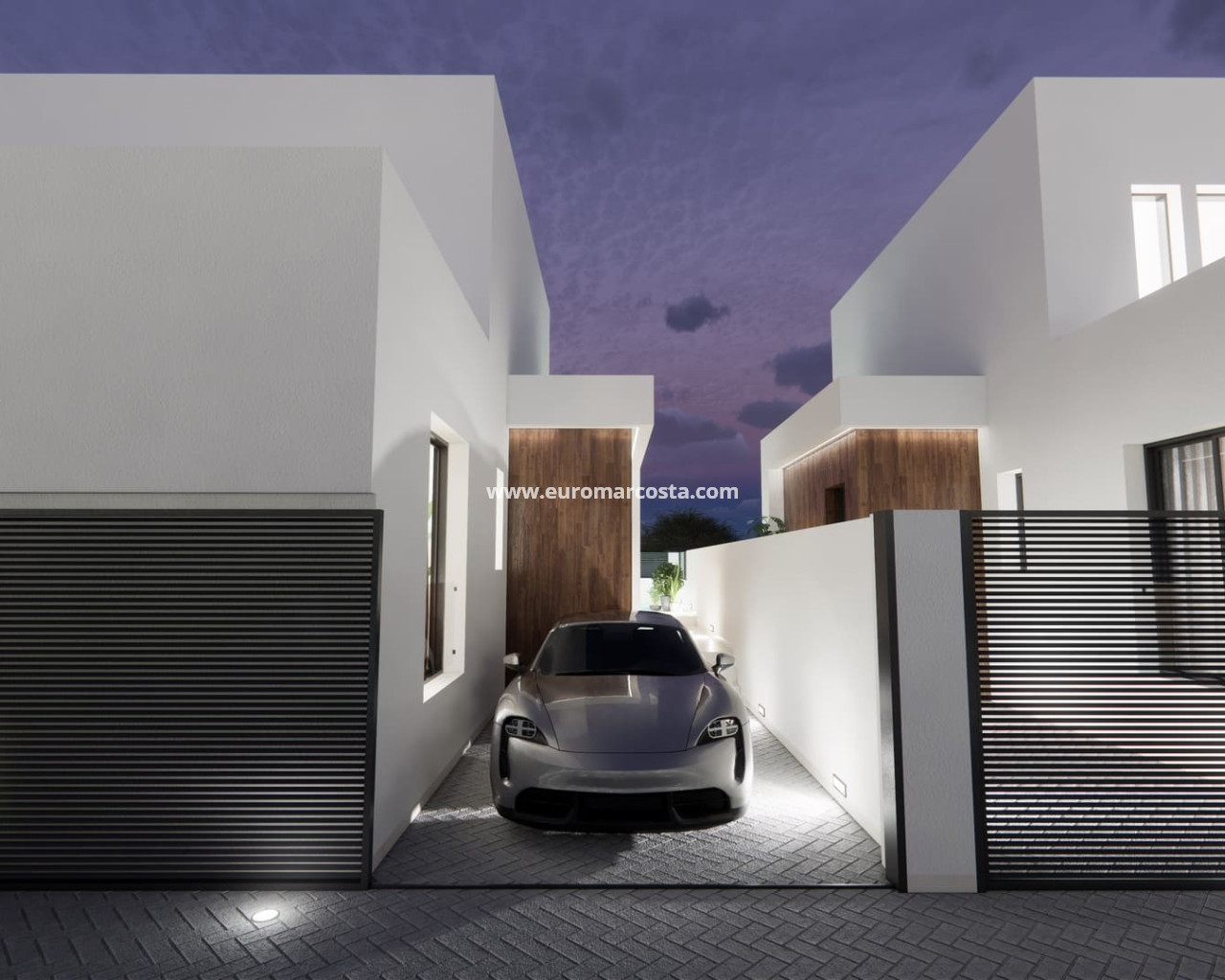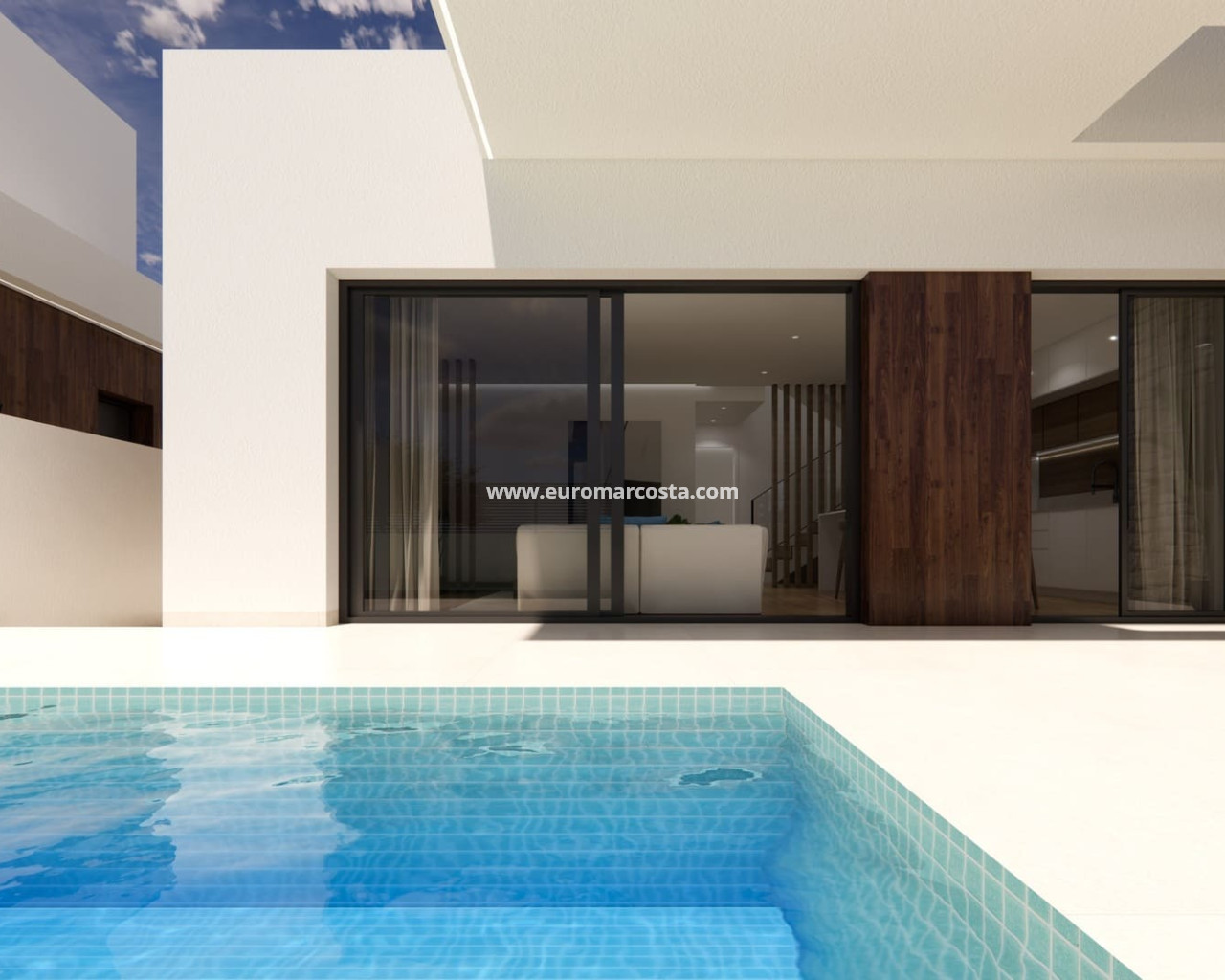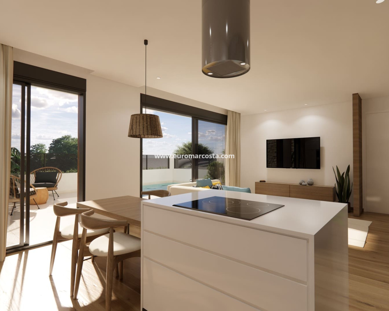 The exterior design of these semi-detached villas combines modernity and functionality, with a minimalist aesthetic that blends harmoniously into the peaceful surroundings of Dolores. Each property has its own plot of 155 m², with a private garden, swimming pool and a 36 m² terrace to enjoy the Mediterranean climate in the open air. The facades are finished in light tones that reflect the natural light and enhance the contemporary style of the development. In addition, each villa has a private parking space, providing security and convenience in accessing the property.