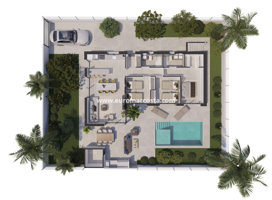 The interior of these villas is designed to offer a cosy and functional environment. With 3 double bedrooms and 2 bathrooms, the villas provide a spacious and comfortable space for the whole family. The open-plan, modern and fully equipped kitchen integrates seamlessly with the living-dining room, creating a bright and open space. The high quality finishes and contemporary design ensure an elegant and comfortable atmosphere. The pre-installation of air conditioning allows residents to customise the air conditioning according to their needs.