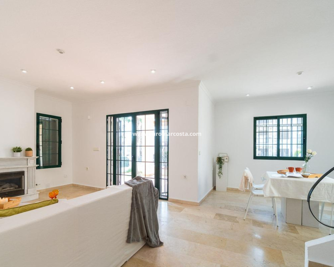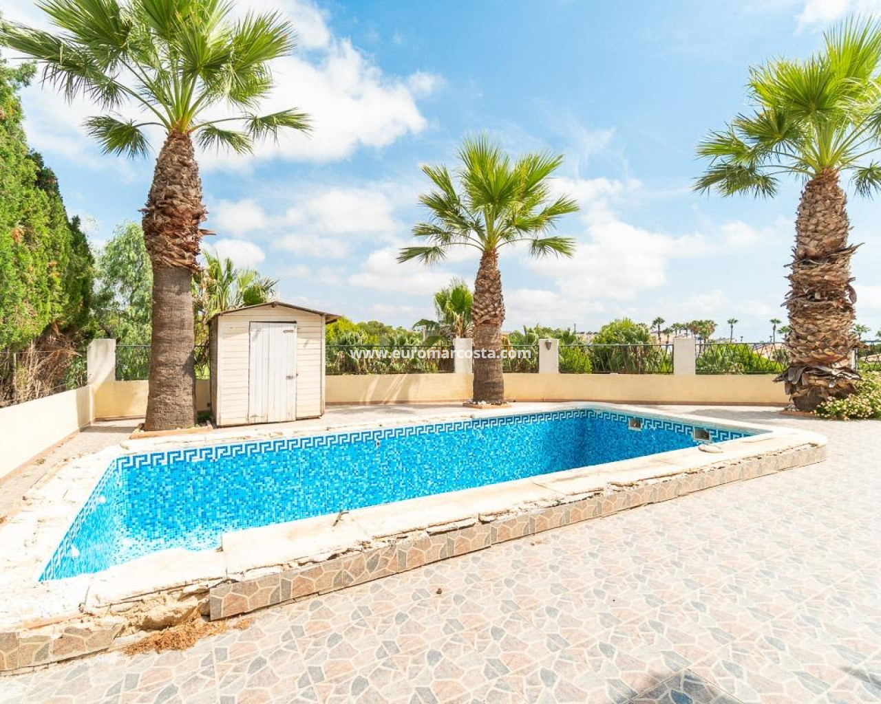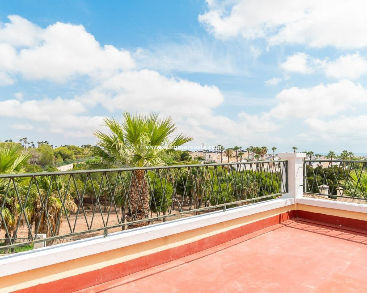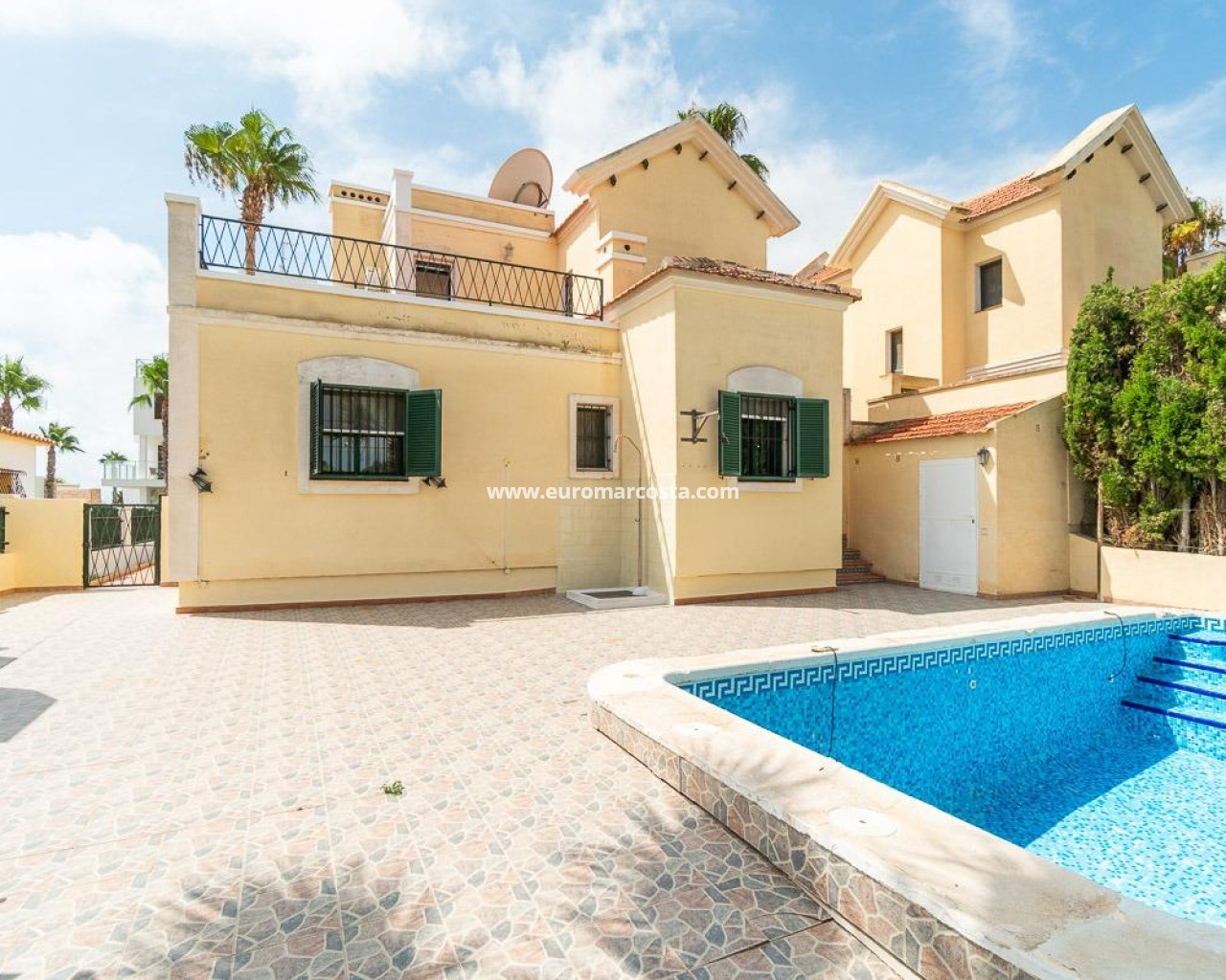 In one of the quietest and most exclusive areas of the VillaMartin development, very close to three golf courses and with its own garden and pool, lies this beautiful villa overlooking green areas, perfect for a large family.. The property is located near three golf courses: Las Ramblas, Campoamor, and Villamartín. It also has easy access to the AP-7 motorway exit, with direct connections to the airports of Alicante (approx. 40 km) and Murcia (approx. 40 km).. It features a communal pool with gardens, where you can enjoy sunbathing and swimming with the rest of the neighbors. It also has its own garden and tiled terraces, and a pool in need of renovation.. The villa's size is ideal for those looking for space, or for entertaining guests and friends; with its 3 bedrooms, 2 bathrooms, and a good-sized plot and garden area.. The 410-square-meter plot is perfect for having space and a sense of independence, with its paved front garden with a vehicle entrance and a paved rear garden with unobstructed views. However, since it's paved and doesn't have many trees and plants, it doesn't require much maintenance or work. The villa faces south on its main facade, terraces, and solarium, so it has sun practically all day. This villa is undoubtedly the dream of many.. And the layout of the home: accessed from the garden, as mentioned, is the first terrace, facing south-southwest. It has sun all day long, but at the same time, being open to the garden and the street, it lets in a full breeze. This spacious terrace, with room for sofas and tables, leads to the main entrance of the home with a security door, which opens onto the spacious and bright living and dining area with a fireplace. It also has a separate kitchen with its own door and window, allowing you to cook without having to worry about odors and grease entering the rest of the home.. Also on the ground floor is a spacious bedroom with a built-in wardrobe and a bathroom with a walk-in shower. This means that if the family has an elderly person or someone with mobility issues, they can live on this floor alone without having to go up and down stairs.. The first floor, accessible via the two-flight interior staircase with easy access, leads to the other two bedrooms with built-in wardrobes and direct access to the large solarium and balcony. This floor also features a second bathroom, this time with a bathtub for relaxing soaks and built-in furniture.. This means that each floor has its own bathroom, bedrooms, and space to enjoy both the outdoors and indoors, with terraces, making it the perfect home for a large family.. . The home is worth a visit for its spaciousness, its light, its proximity to all amenities and the golf course, and its tranquility.