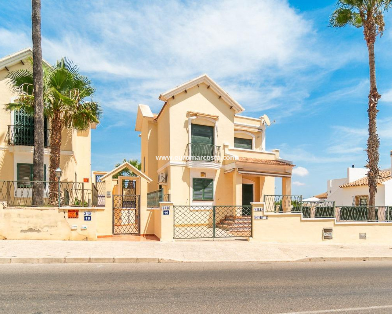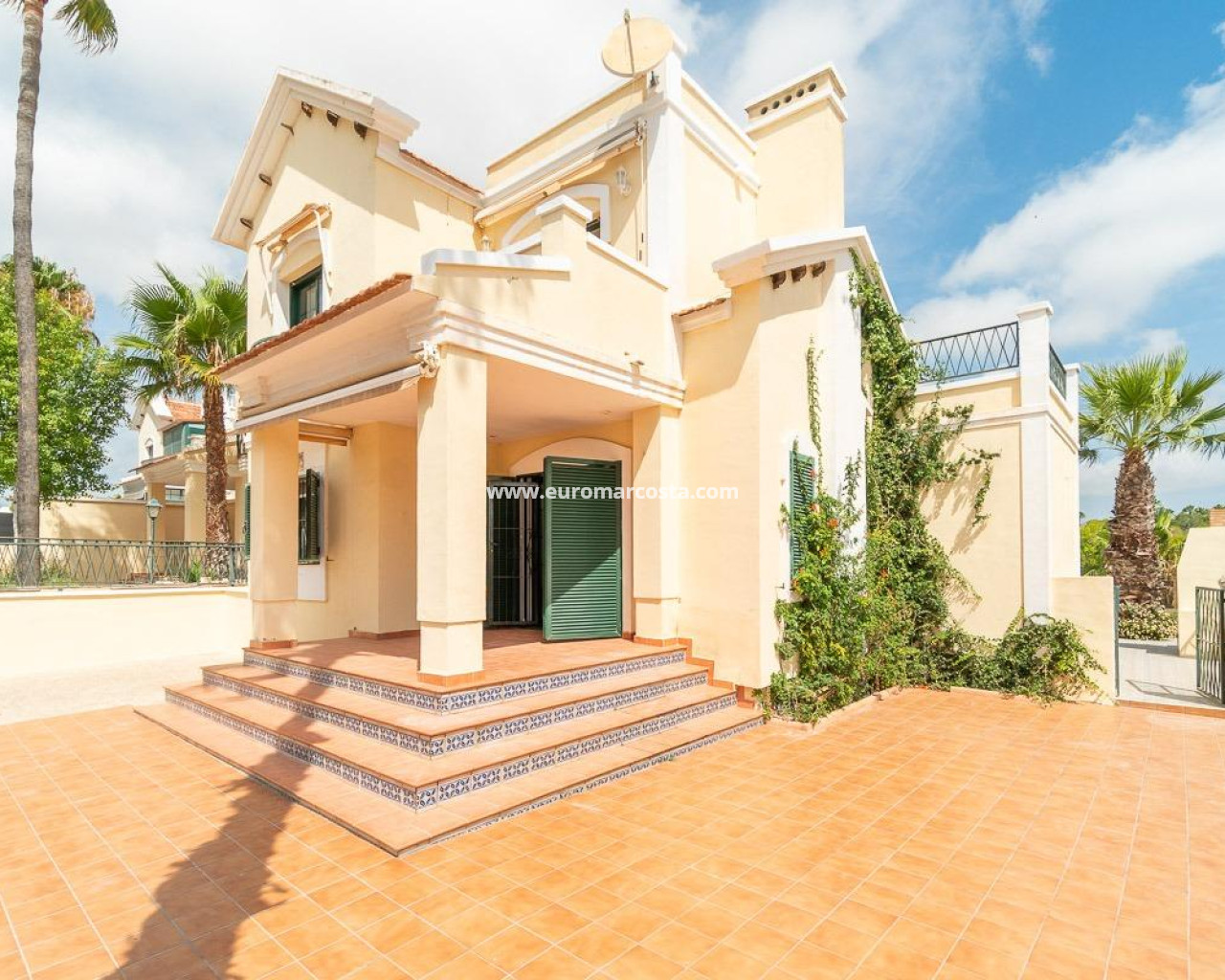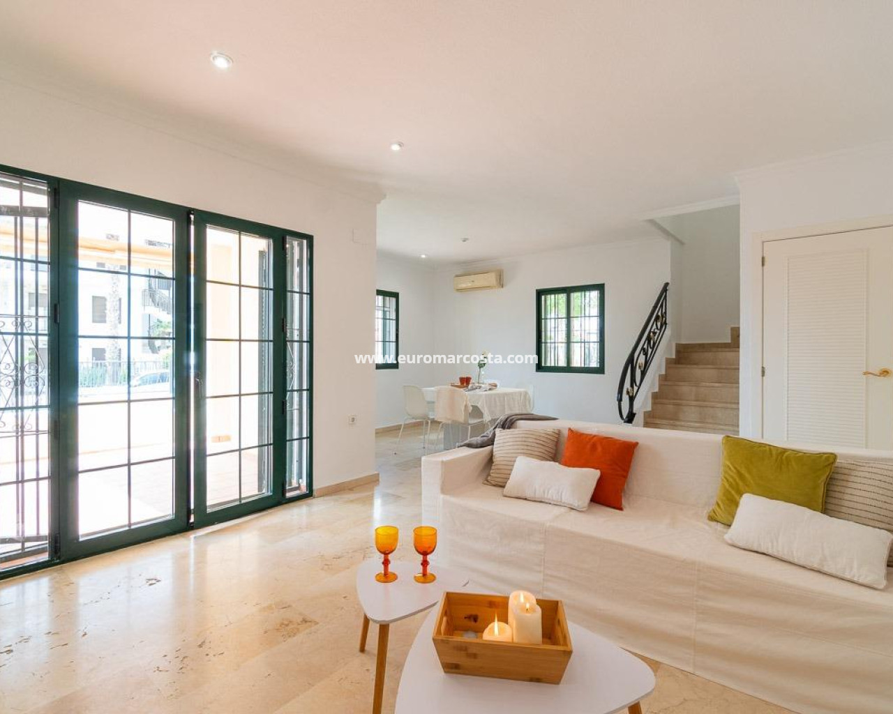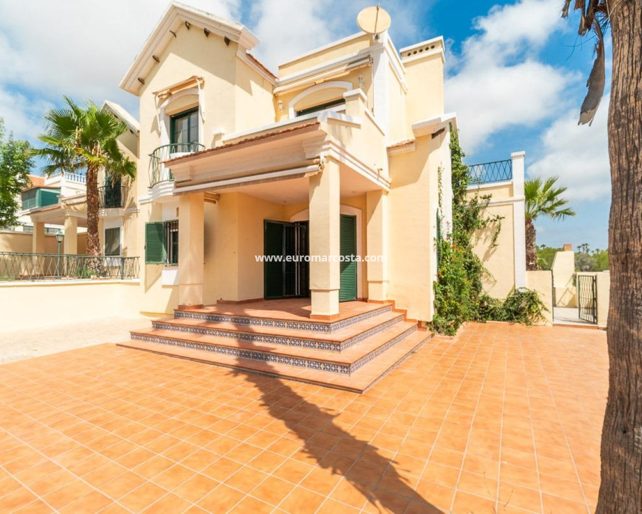 In one of the quietest and most exclusive areas of the VillaMartin development, very close to three golf courses and with its own garden and pool, lies this beautiful villa overlooking green areas, perfect for a large family.. The property is located near three golf courses: Las Ramblas, Campoamor, and Villamartín. It also has easy access to the AP-7 motorway exit, with direct connections to the airports of Alicante (approx. 40 km) and Murcia (approx. 40 km).. It features a communal pool with gardens, where you can enjoy sunbathing and swimming with the rest of the neighbors. It also has its own garden and tiled terraces, and a pool in need of renovation.. The villa's size is ideal for those looking for space, or for entertaining guests and friends; with its 3 bedrooms, 2 bathrooms, and a good-sized plot and garden area.. The 410-square-meter plot is perfect for having space and a sense of independence, with its paved front garden with a vehicle entrance and a paved rear garden with unobstructed views. However, since it's paved and doesn't have many trees and plants, it doesn't require much maintenance or work. The villa faces south on its main facade, terraces, and solarium, so it has sun practically all day. This villa is undoubtedly the dream of many.. And the layout of the home: accessed from the garden, as mentioned, is the first terrace, facing south-southwest. It has sun all day long, but at the same time, being open to the garden and the street, it lets in a full breeze. This spacious terrace, with room for sofas and tables, leads to the main entrance of the home with a security door, which opens onto the spacious and bright living and dining area with a fireplace. It also has a separate kitchen with its own door and window, allowing you to cook without having to worry about odors and grease entering the rest of the home.. Also on the ground floor is a spacious bedroom with a built-in wardrobe and a bathroom with a walk-in shower. This means that if the family has an elderly person or someone with mobility issues, they can live on this floor alone without having to go up and down stairs.. The first floor, accessible via the two-flight interior staircase with easy access, leads to the other two bedrooms with built-in wardrobes and direct access to the large solarium and balcony. This floor also features a second bathroom, this time with a bathtub for relaxing soaks and built-in furniture.. This means that each floor has its own bathroom, bedrooms, and space to enjoy both the outdoors and indoors, with terraces, making it the perfect home for a large family.. . The home is worth a visit for its spaciousness, its light, its proximity to all amenities and the golf course, and its tranquility.