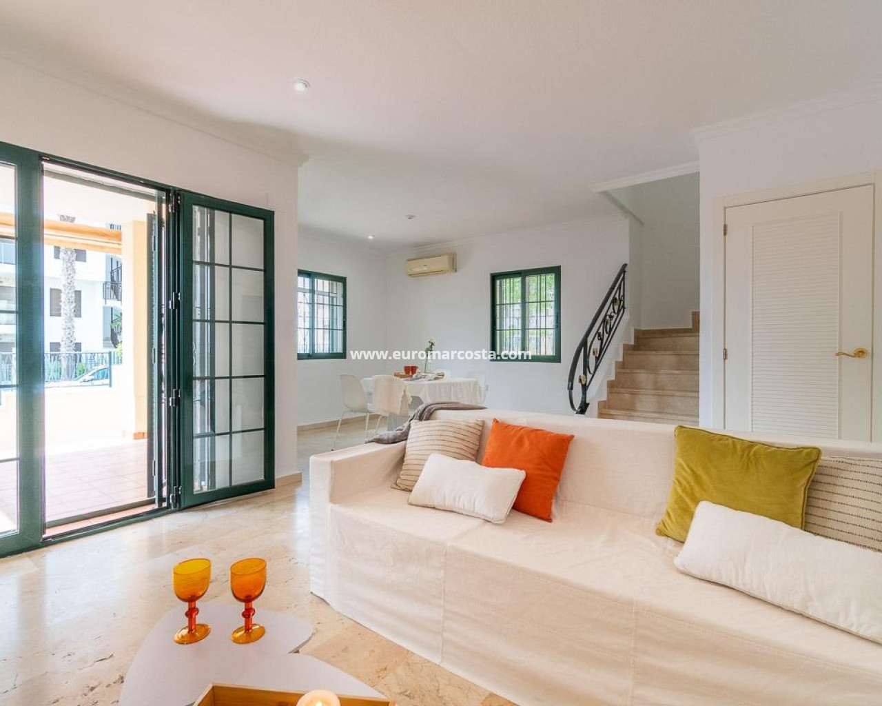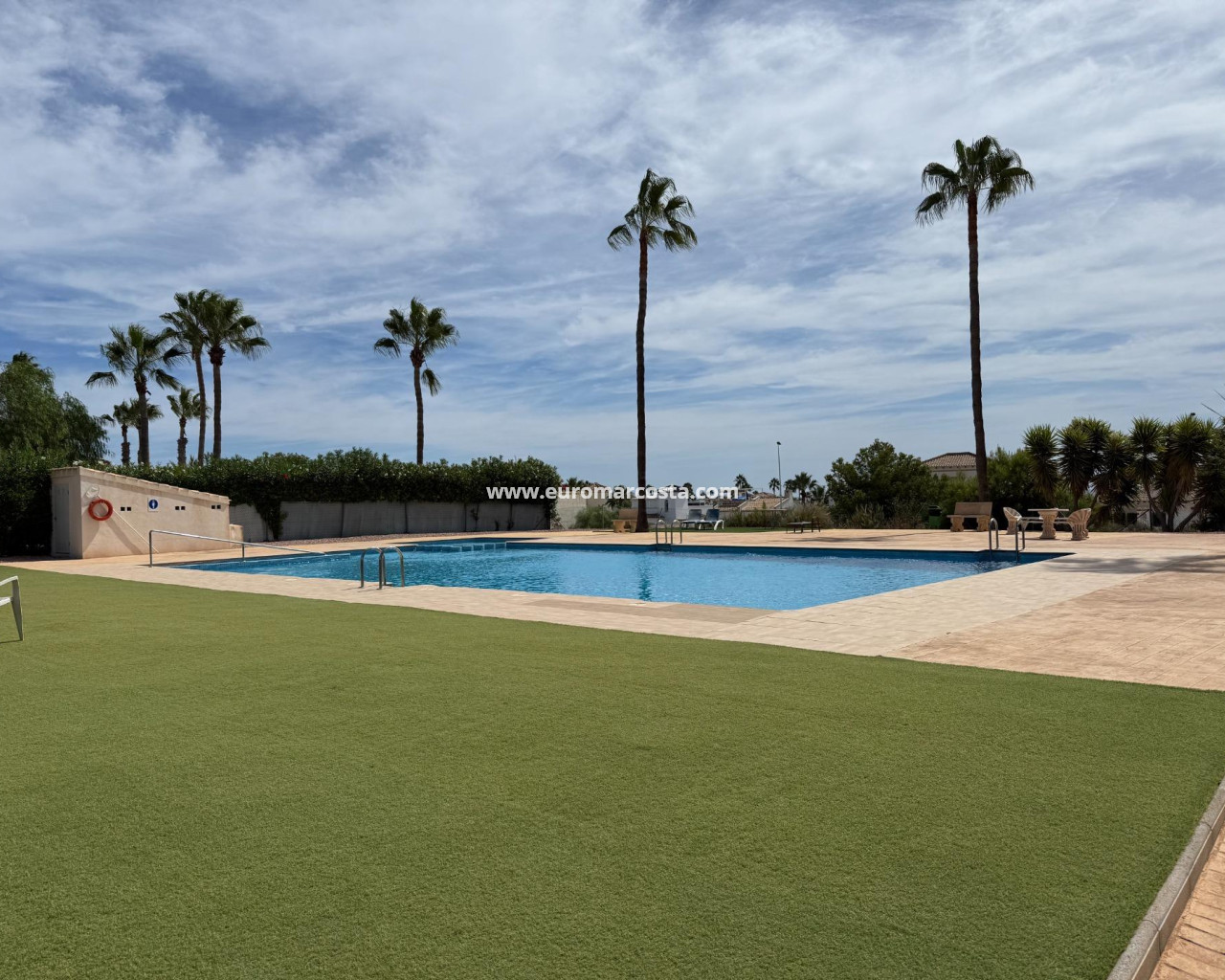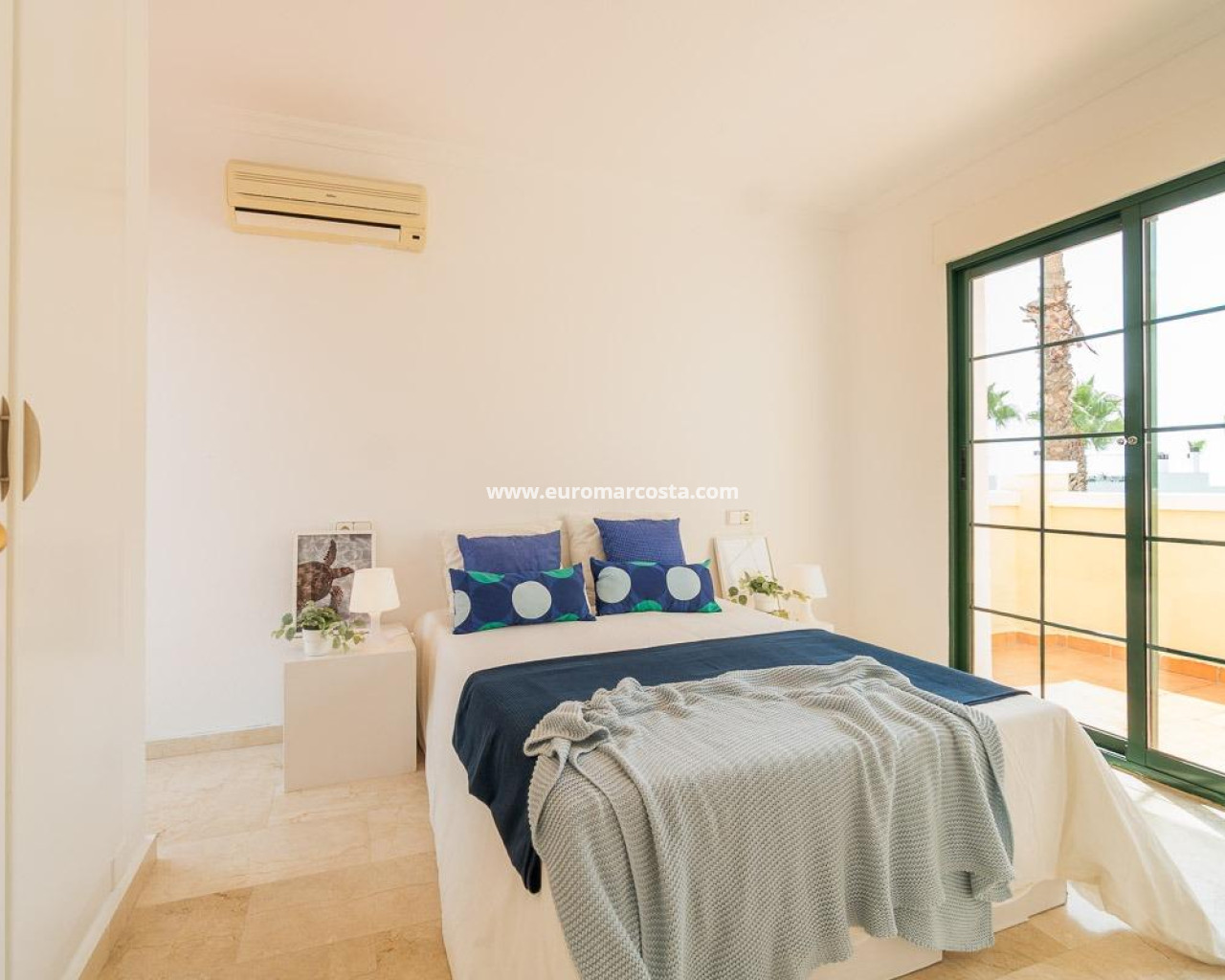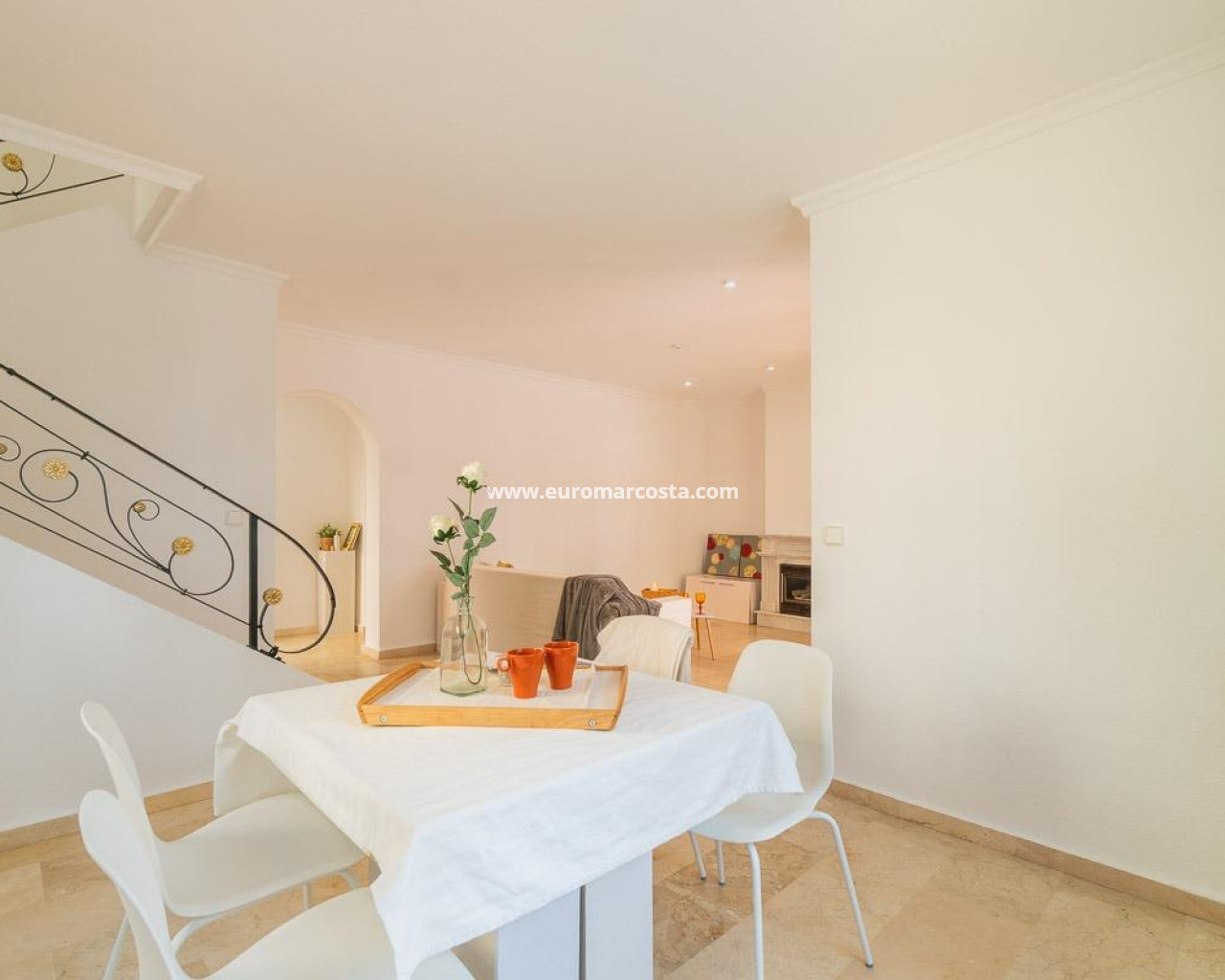 In one of the quietest and most exclusive areas of the VillaMartin development, very close to three golf courses and with its own garden and pool, lies this beautiful villa overlooking green areas, perfect for a large family.. The property is located near three golf courses: Las Ramblas, Campoamor, and Villamartín. It also has easy access to the AP-7 motorway exit, with direct connections to the airports of Alicante (approx. 40 km) and Murcia (approx. 40 km).. It features a communal pool with gardens, where you can enjoy sunbathing and swimming with the rest of the neighbors. It also has its own garden and tiled terraces, and a pool in need of renovation.. The villa's size is ideal for those looking for space, or for entertaining guests and friends; with its 3 bedrooms, 2 bathrooms, and a good-sized plot and garden area.. The 410-square-meter plot is perfect for having space and a sense of independence, with its paved front garden with a vehicle entrance and a paved rear garden with unobstructed views. However, since it's paved and doesn't have many trees and plants, it doesn't require much maintenance or work. The villa faces south on its main facade, terraces, and solarium, so it has sun practically all day. This villa is undoubtedly the dream of many.. And the layout of the home: accessed from the garden, as mentioned, is the first terrace, facing south-southwest. It has sun all day long, but at the same time, being open to the garden and the street, it lets in a full breeze. This spacious terrace, with room for sofas and tables, leads to the main entrance of the home with a security door, which opens onto the spacious and bright living and dining area with a fireplace. It also has a separate kitchen with its own door and window, allowing you to cook without having to worry about odors and grease entering the rest of the home.. Also on the ground floor is a spacious bedroom with a built-in wardrobe and a bathroom with a walk-in shower. This means that if the family has an elderly person or someone with mobility issues, they can live on this floor alone without having to go up and down stairs.. The first floor, accessible via the two-flight interior staircase with easy access, leads to the other two bedrooms with built-in wardrobes and direct access to the large solarium and balcony. This floor also features a second bathroom, this time with a bathtub for relaxing soaks and built-in furniture.. This means that each floor has its own bathroom, bedrooms, and space to enjoy both the outdoors and indoors, with terraces, making it the perfect home for a large family.. . The home is worth a visit for its spaciousness, its light, its proximity to all amenities and the golf course, and its tranquility.