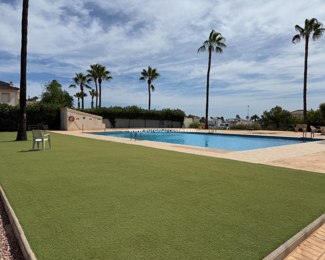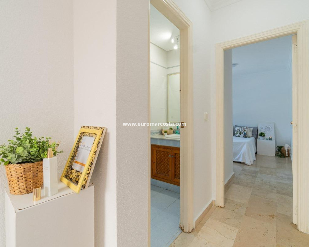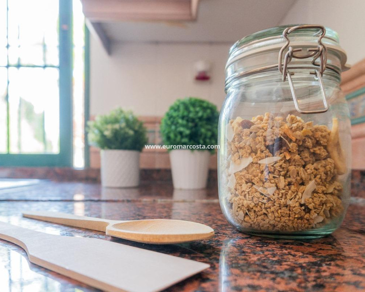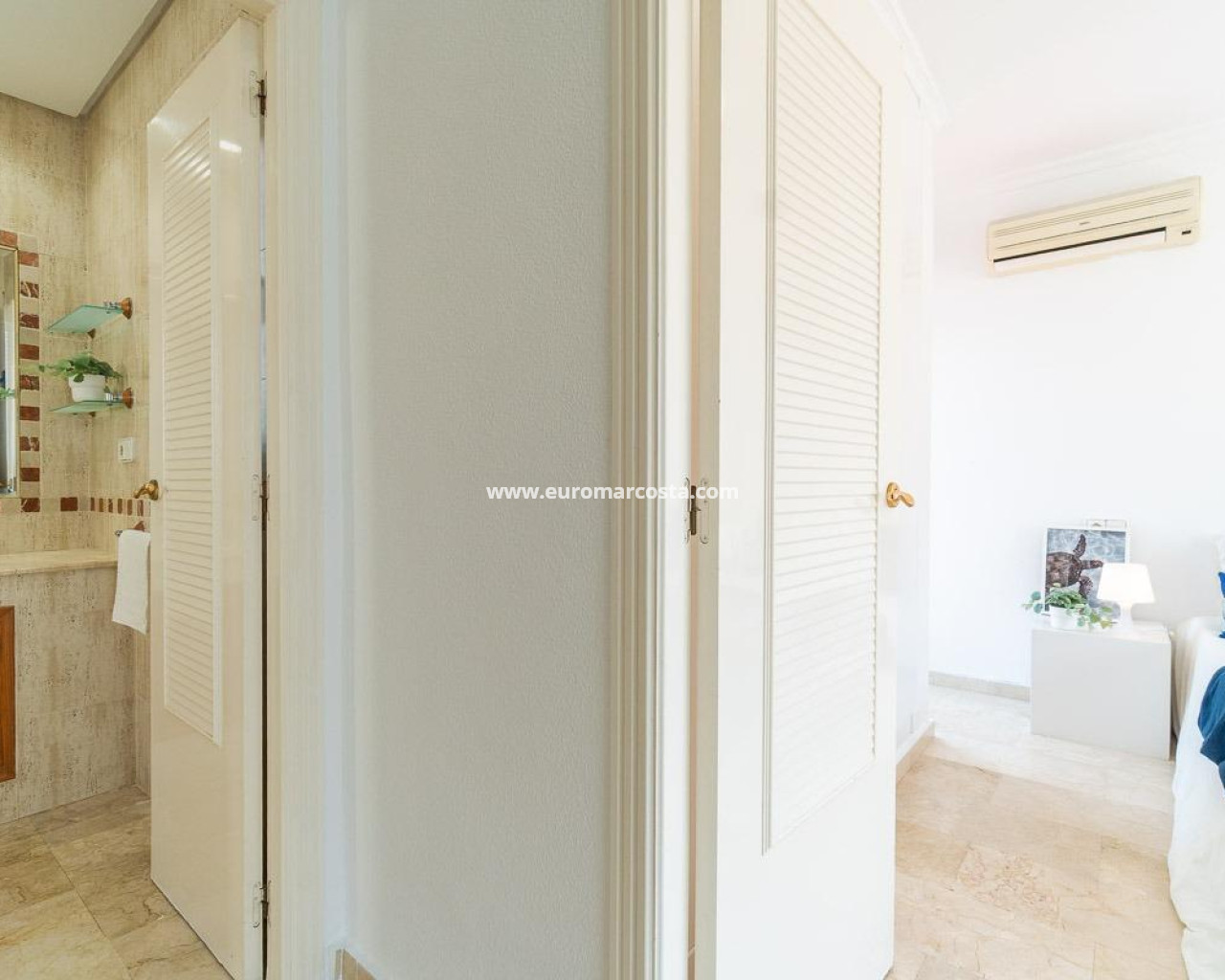 In one of the quietest and most exclusive areas of the VillaMartin development, very close to three golf courses and with its own garden and pool, lies this beautiful villa overlooking green areas, perfect for a large family.. The property is located near three golf courses: Las Ramblas, Campoamor, and Villamartín. It also has easy access to the AP-7 motorway exit, with direct connections to the airports of Alicante (approx. 40 km) and Murcia (approx. 40 km).. It features a communal pool with gardens, where you can enjoy sunbathing and swimming with the rest of the neighbors. It also has its own garden and tiled terraces, and a pool in need of renovation.. The villa's size is ideal for those looking for space, or for entertaining guests and friends; with its 3 bedrooms, 2 bathrooms, and a good-sized plot and garden area.. The 410-square-meter plot is perfect for having space and a sense of independence, with its paved front garden with a vehicle entrance and a paved rear garden with unobstructed views. However, since it's paved and doesn't have many trees and plants, it doesn't require much maintenance or work. The villa faces south on its main facade, terraces, and solarium, so it has sun practically all day. This villa is undoubtedly the dream of many.. And the layout of the home: accessed from the garden, as mentioned, is the first terrace, facing south-southwest. It has sun all day long, but at the same time, being open to the garden and the street, it lets in a full breeze. This spacious terrace, with room for sofas and tables, leads to the main entrance of the home with a security door, which opens onto the spacious and bright living and dining area with a fireplace. It also has a separate kitchen with its own door and window, allowing you to cook without having to worry about odors and grease entering the rest of the home.. Also on the ground floor is a spacious bedroom with a built-in wardrobe and a bathroom with a walk-in shower. This means that if the family has an elderly person or someone with mobility issues, they can live on this floor alone without having to go up and down stairs.. The first floor, accessible via the two-flight interior staircase with easy access, leads to the other two bedrooms with built-in wardrobes and direct access to the large solarium and balcony. This floor also features a second bathroom, this time with a bathtub for relaxing soaks and built-in furniture.. This means that each floor has its own bathroom, bedrooms, and space to enjoy both the outdoors and indoors, with terraces, making it the perfect home for a large family.. . The home is worth a visit for its spaciousness, its light, its proximity to all amenities and the golf course, and its tranquility.