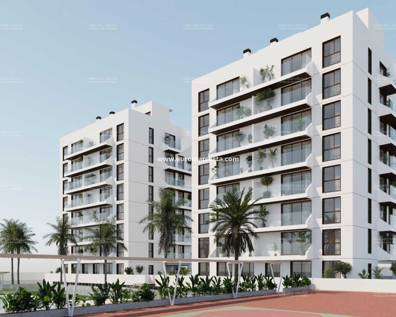 The interior of the homes in this residential complex in Guardamar del Segura is designed to offer maximum comfort and functionality. With a layout that includes two bedrooms and two bathrooms, each space is optimized for the well-being of its residents. Porcelain tile floors add a touch of elegance and are easy to maintain, while air conditioning ensures a pleasant environment throughout the year. The homes are equipped with modern appliances, facilitating daily life and allowing for a fully functional home from day one. The video intercom adds an additional level of security, providing peace of mind to residents. Every detail has been carefully considered to create a welcoming and modern space, ideal for families or couples looking for a home in a prime location.