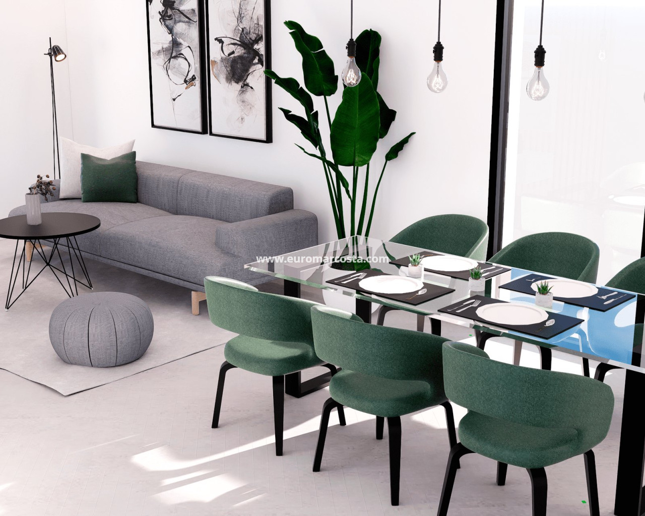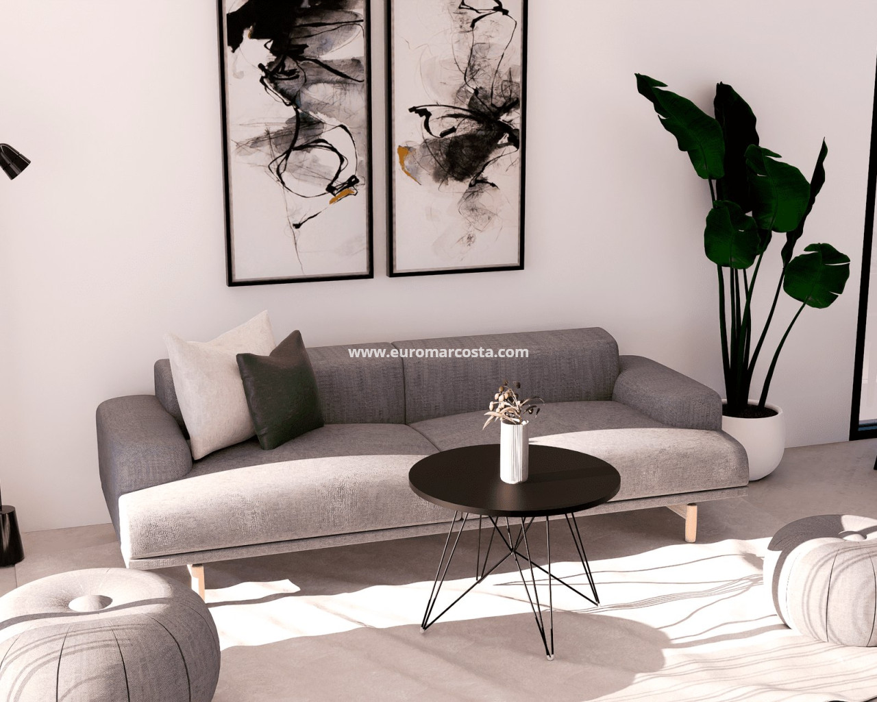 The interior of the homes is carefully designed to offer comfort and modernity. The apartments, ground-floor units, and penthouses feature porcelain stoneware floors, adding an elegant touch and easy maintenance. All properties are equipped with air conditioning, ensuring a pleasant environment year-round. Built-in wardrobes provide ample storage space, while the video intercom adds an extra level of security and convenience. The layout includes two bedrooms and two bathrooms, catering to the needs of different types of families.
