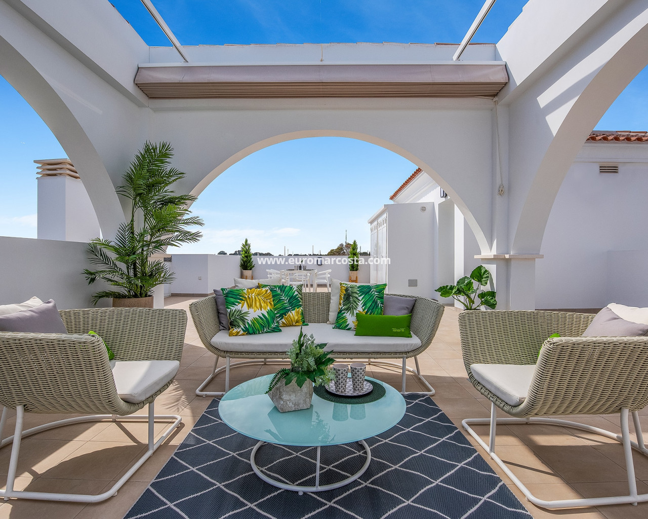 The exteriors of these homes are designed to offer a space for relaxation and outdoor enjoyment. Each bungalow features a private garden, perfect for enjoying the Mediterranean climate. Additionally, the terraces and solariums provide extra leisure space, allowing residents to enjoy unobstructed views and moments of tranquility. The presence of pergolas adds a touch of elegance and functionality, offering shade and style to the outdoor spaces.