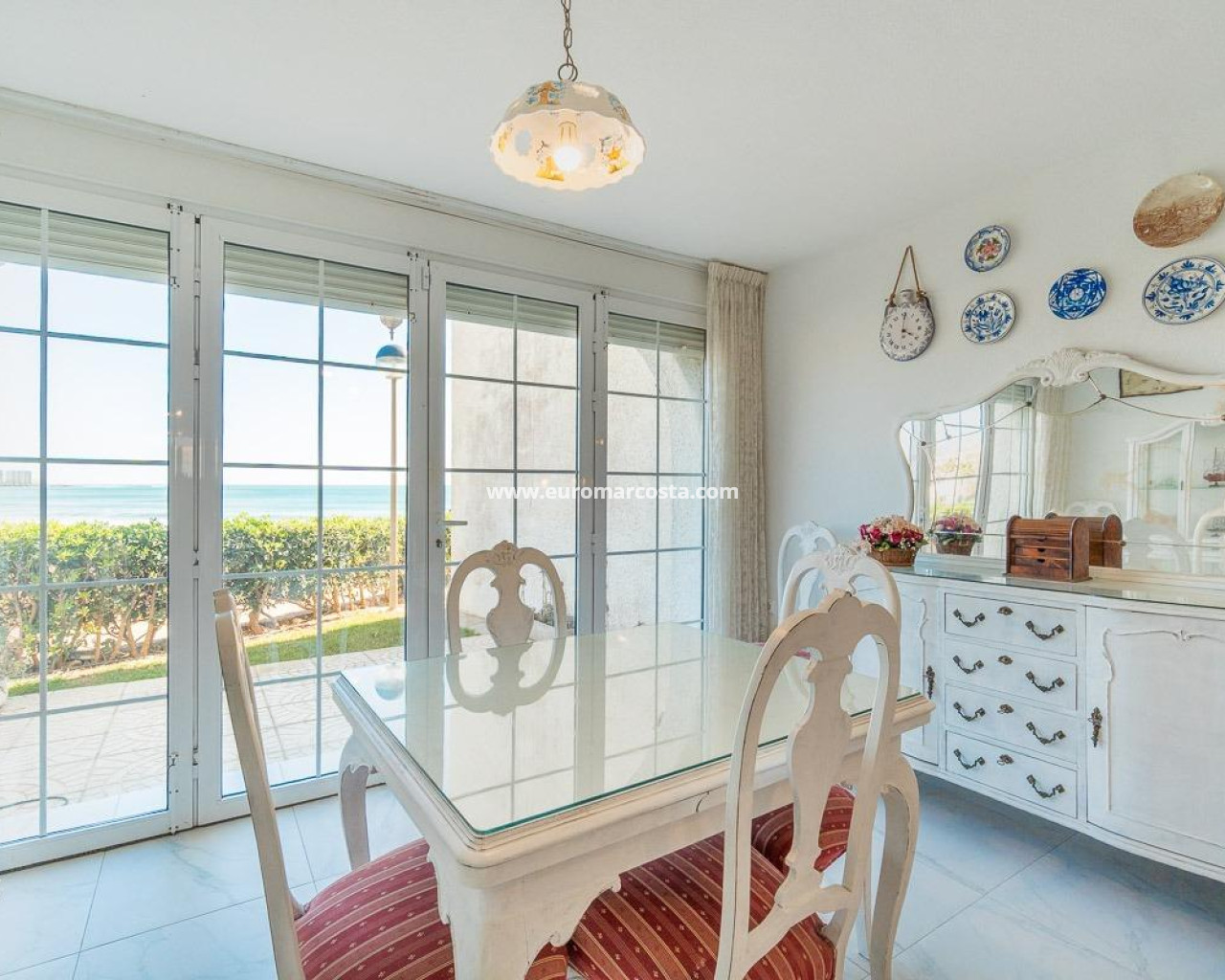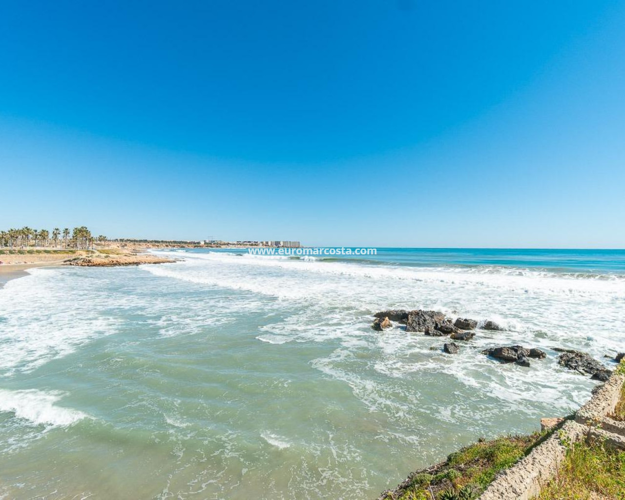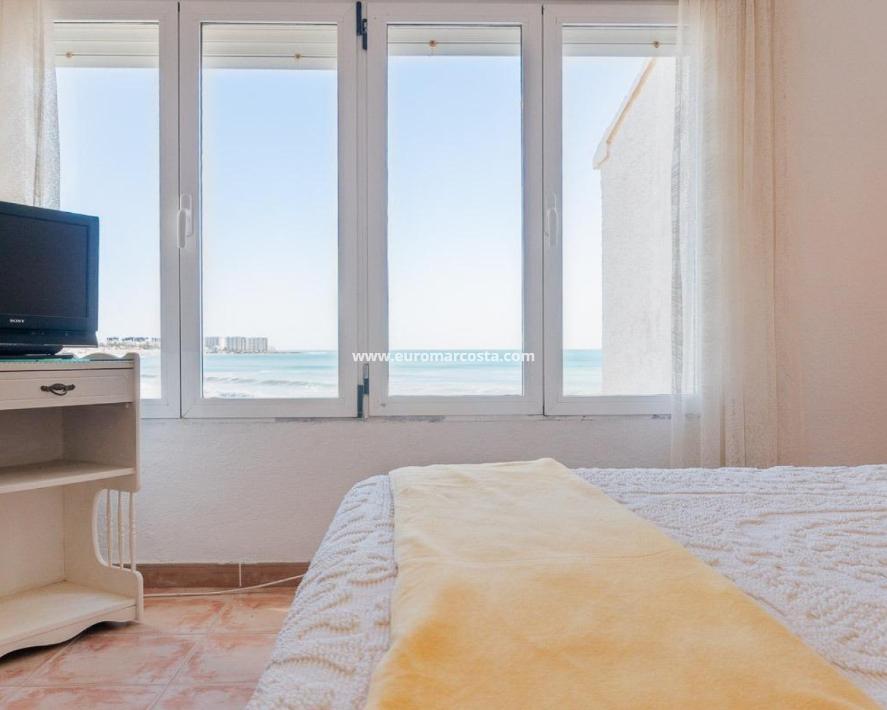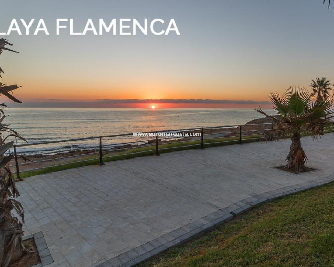 Discover a unique gem on the seafront in the prestigious area of Playa Flamenca, where properties rarely come onto the market due to its privileged cliffside location.. . This charming townhouse, with 90 m2 built, offers an unparalleled Mediterranean lifestyle. On the ground floor, you will find a spacious living room filled with natural light, featuring a large front window with direct access to the garden, where you can enjoy open views and the soothing sound of the sea. The kitchen is independent, practical, and perfectly suited for everyday living. At the entrance, there is also a cozy private garden that adds a welcoming touch.. . Upstairs, there are two spacious double bedrooms. The master bedroom is truly exceptional: imagine waking up and enjoying sea views directly from your bed. This floor also includes a fully equipped bathroom.. . The property is part of an exclusive residential complex with a communal swimming pool, perfect for enjoying the Mediterranean climate all year round. In this highly sought-after area, where properties are rarely available, this home represents a unique opportunity both as a permanent residence or an investment.. . Living here means embracing a seafront lifestyle in one of the most desirable locations in Orihuela Costa.. . A truly exceptional property where the sea becomes part of your home.. . Price: €390,000. Taxes and purchase costs not included (according to applicable regulations). A detailed breakdown of additional costs will be provided prior to reservation.