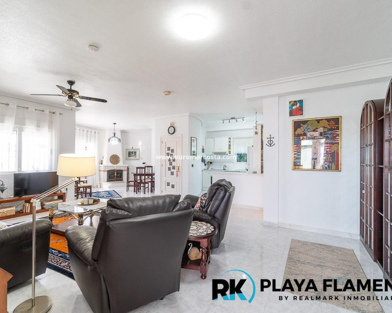 This large detached villa, situated on a 500 m2 plot with over 190 m2 of living space, is superbly located in the heart of Playa Flamenca. It is truly within walking distance of everything: supermarkets, municipal and private sports facilities, the Zenia Boulevard shopping center, a public school, the town hall, shops, doctors, and the beaches of Orihuela Costa.. . The Saturday market is very close, with direct walking access, allowing you to enjoy shopping for fruits, vegetables, and traditional products while experiencing the atmosphere of a small Spanish village. At the same time, you can easily access the property by car without encountering road closures.. . The 500 m2 plot, as mentioned, offers numerous possibilities for enjoying the outdoor space, including a swimming pool, barbecue, outdoor kitchen, solarium, pergolas, parking, and more. Maintenance is very easy, with terraces, artificial grass, and gravel areas, ensuring that keeping your garden and outdoor areas in perfect condition requires minimal effort.. . The property features on-site parking with automatic gates and a private garage/storage area to keep your vehicle protected from the Alicante sun. The pool area is perfect for sunbathing in privacy, while the built-in barbecue and wooden pergola allow you to fully utilize the plot's potential, thanks to its southern exposure and sun exposure throughout the day. This also ensures abundant natural light throughout the property's daytime living areas.. . There is a glazed solarium terrace at the entrance to the house, but with its traditional clay tile roof. In winter, when the sun is lower, it can be used for sunbathing, and in summer, by opening the glass windows and enjoying the shade of the roof, it becomes a cool and airy space where you can relax with a book and spend time with family in a semi-covered outdoor area. From this covered terrace with arches, you enter the main house with its large living-dining room, featuring a fireplace and south-facing windows for maximum natural light and sunshine, and a semi-independent kitchen with a breakfast bar and an adjacent utility room that combines pantry and laundry space.. On the same ground floor, the house has two spacious bedrooms with built-in wardrobes, a bathroom with a walk-in shower, and the staircase leading to the upper floor.. . Upstairs, you'll find the large master bedroom overlooking its own garden and swimming pool, a large bathroom with a walk-in shower, and a large glazed space perfect for a playroom, office, guest room, or any other use. This is complemented by the rest of the solarium, which offers sea views and a south-facing orientation, ensuring sunshine all day long.. . In short, this is a detached villa in a central and well-connected location, with outdoor areas for leisure and family enjoyment. It is in perfect condition and ready to move into, and a visit is well worth it to appreciate its excellent features.. . Price: €640,000. Taxes and closing costs not included (according to applicable regulations). A breakdown of additional costs will be provided before booking.. . In the case of a transaction with two intermediaries, the buyer's professional fees will be 1.5% of the final purchase price, with a minimum of €3,000, plus VAT (21%), unless expressly agreed otherwise. These fees are not included in the advertised price.