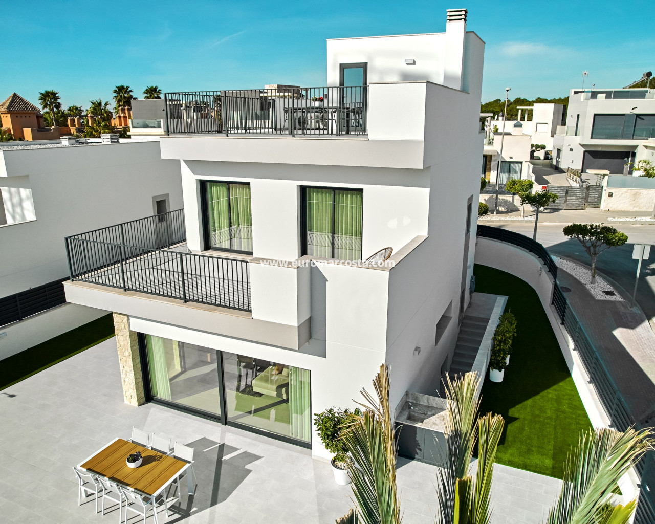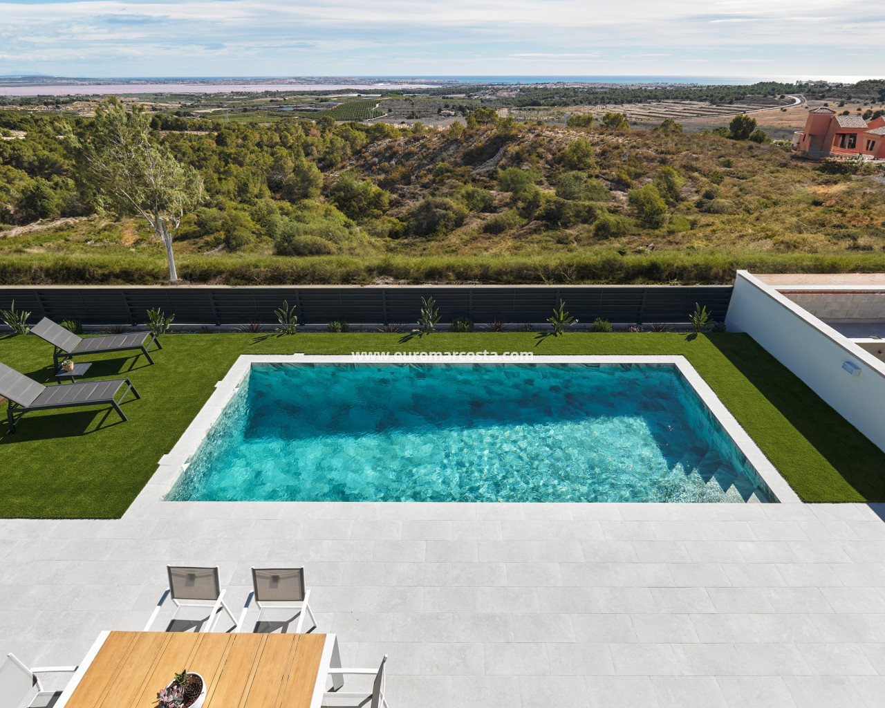 Los exteriores de estas propiedades en San Miguel de Salinas están pensados para ofrecer un espacio de relajación y disfrute al aire libre. Cada vivienda cuenta con una terraza, ideal para disfrutar de las vistas al mar y del clima mediterráneo. Además, se ofrece la opción de un solárium, perfecto para aquellos que desean un espacio adicional para tomar el sol o disfrutar de las noches estrelladas. El diseño exterior se complementa con la posibilidad de un garaje, proporcionando comodidad y seguridad para los vehículos de los residentes.