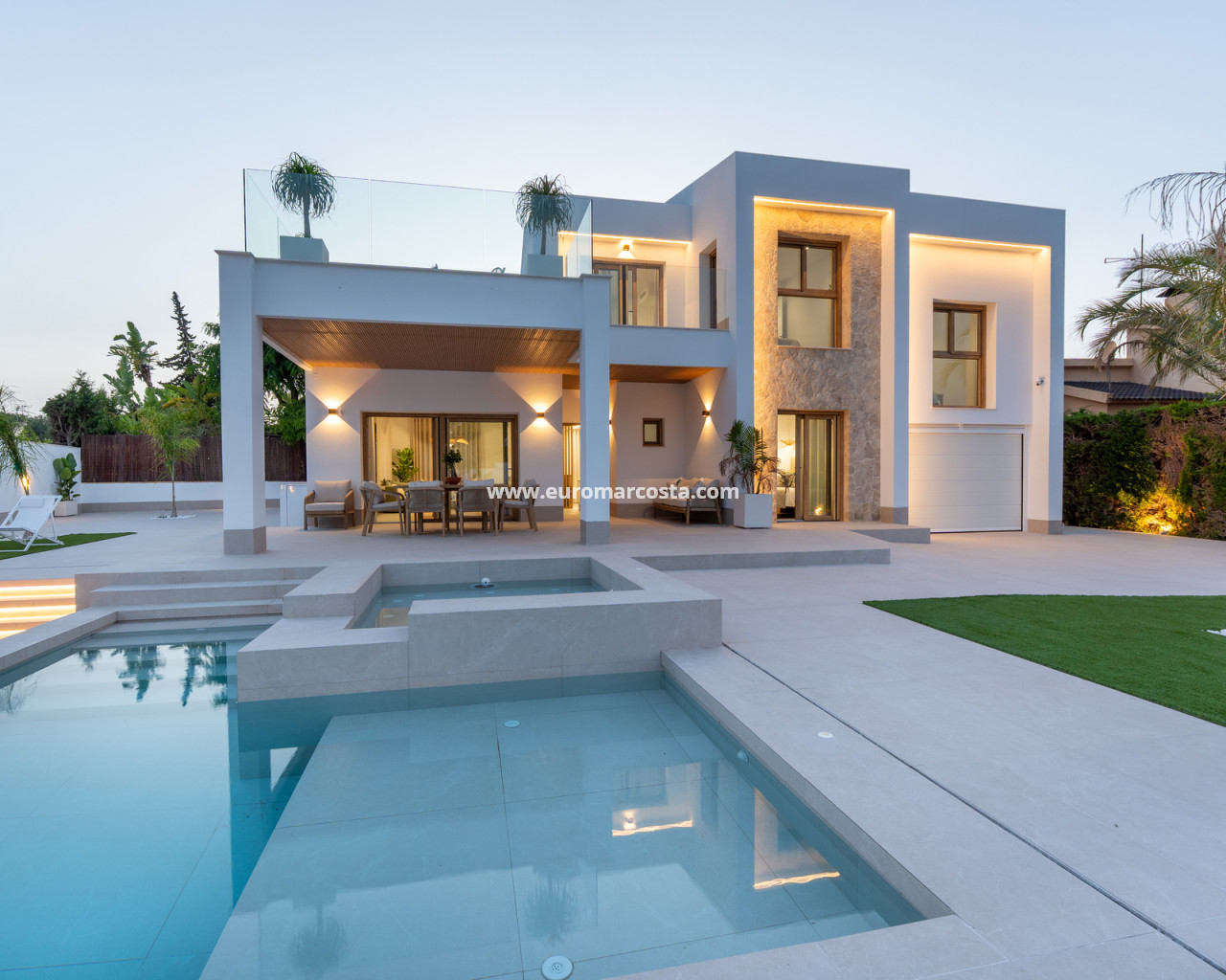 El interior de la villa está equipado con características modernas y de alta calidad. Los suelos de gres porcelánico aportan un toque elegante y son fáciles de mantener. La villa viene completamente amueblada, lo que facilita la mudanza y permite disfrutar del confort desde el primer día. La cocina está equipada con electrodomésticos de última generación, haciendo que la preparación de comidas sea una experiencia placentera. El sistema de aire acondicionado garantiza un ambiente fresco durante todo el año. Las persianas eléctricas y el videoportero añaden un nivel extra de comodidad y seguridad. Los armarios empotrados en los dormitorios ofrecen amplio espacio de almacenamiento.