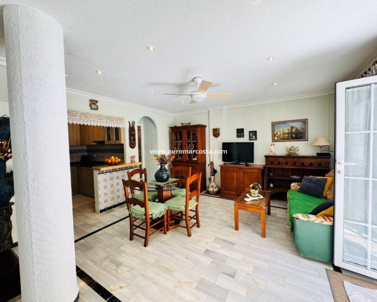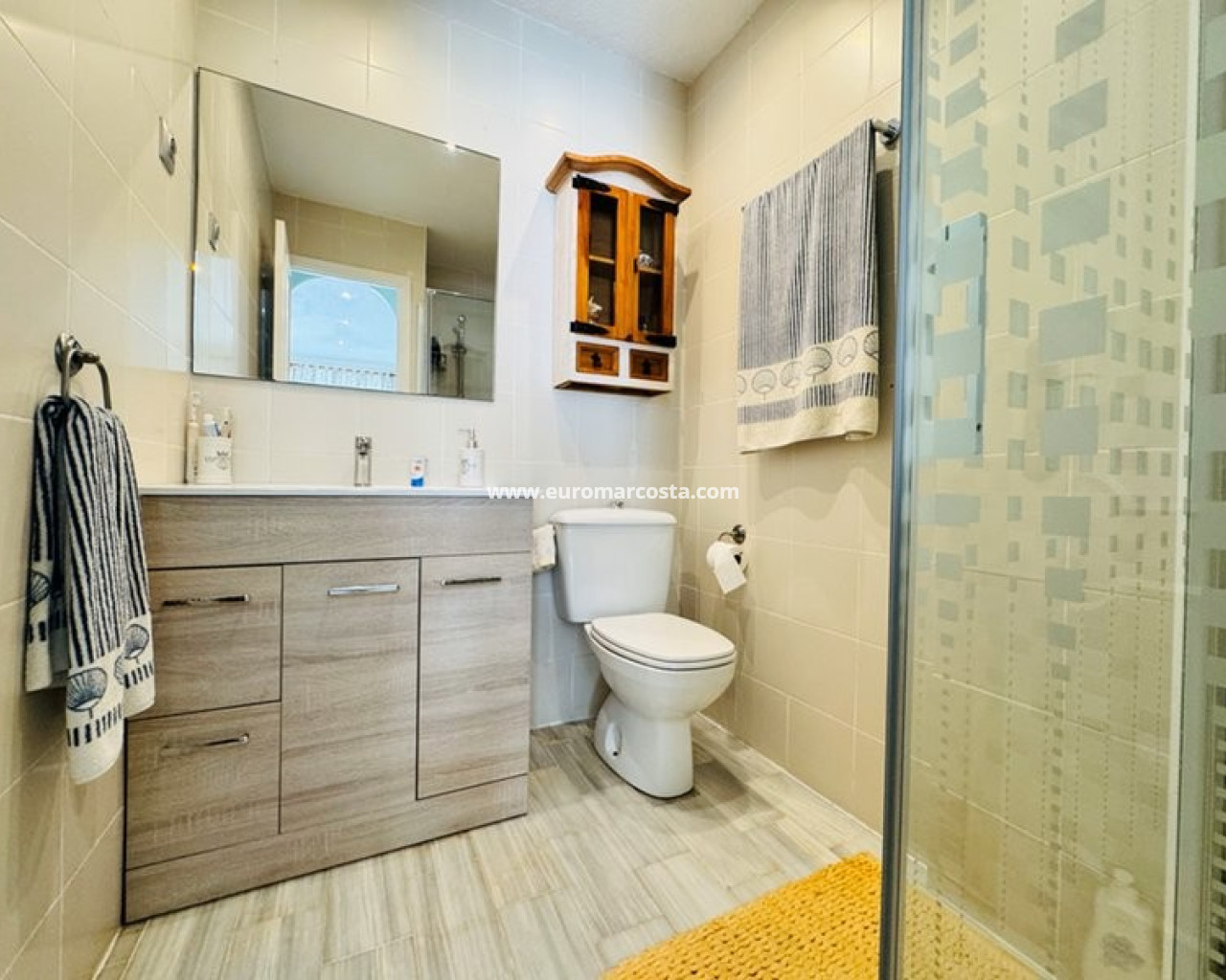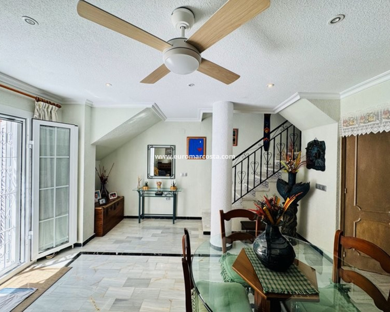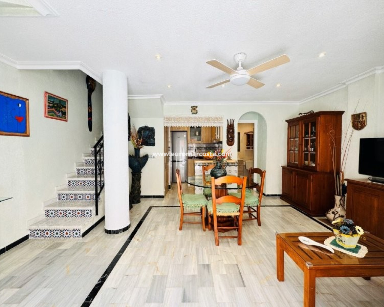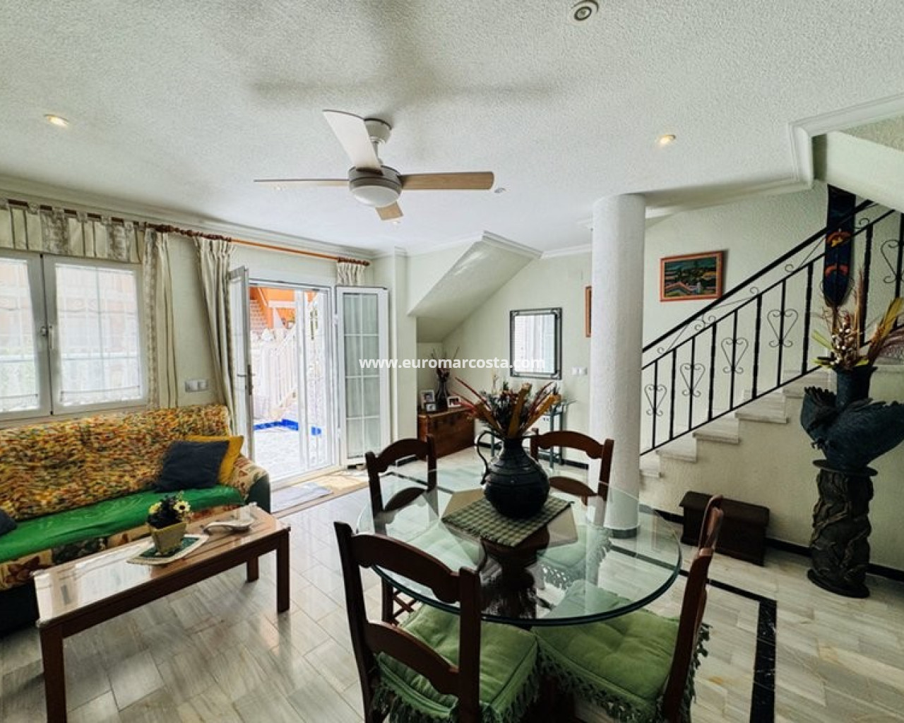 Se trata de una vivienda situada en una de las mejores zonas de La Mata. Urbanización privada con jardines, fuentes y Piscina comunitaria. La vivienda es un Dúplex de 75 m2 + 12 m2 de terraza. Está distribuida en 2 plantas. En la planta principal tenemos una amplia y soleada terraza a la entrada del bungalow, seguido de un amplio salón comedor y cocina americana reformada. Baño completo reformado en planta principal. Además de una despensa y un patio interior. En la planta superior tenemos los 2 dormitorios y otro baño completo muy amplio. La vivienda está IMPECABLE. Tiene orientación Sur y desde el balcón de la habitación principal podemos ver el mar. Ideal para disfrutar de las vacaciones. Comunidad: 360 € al año IBI: 240 €