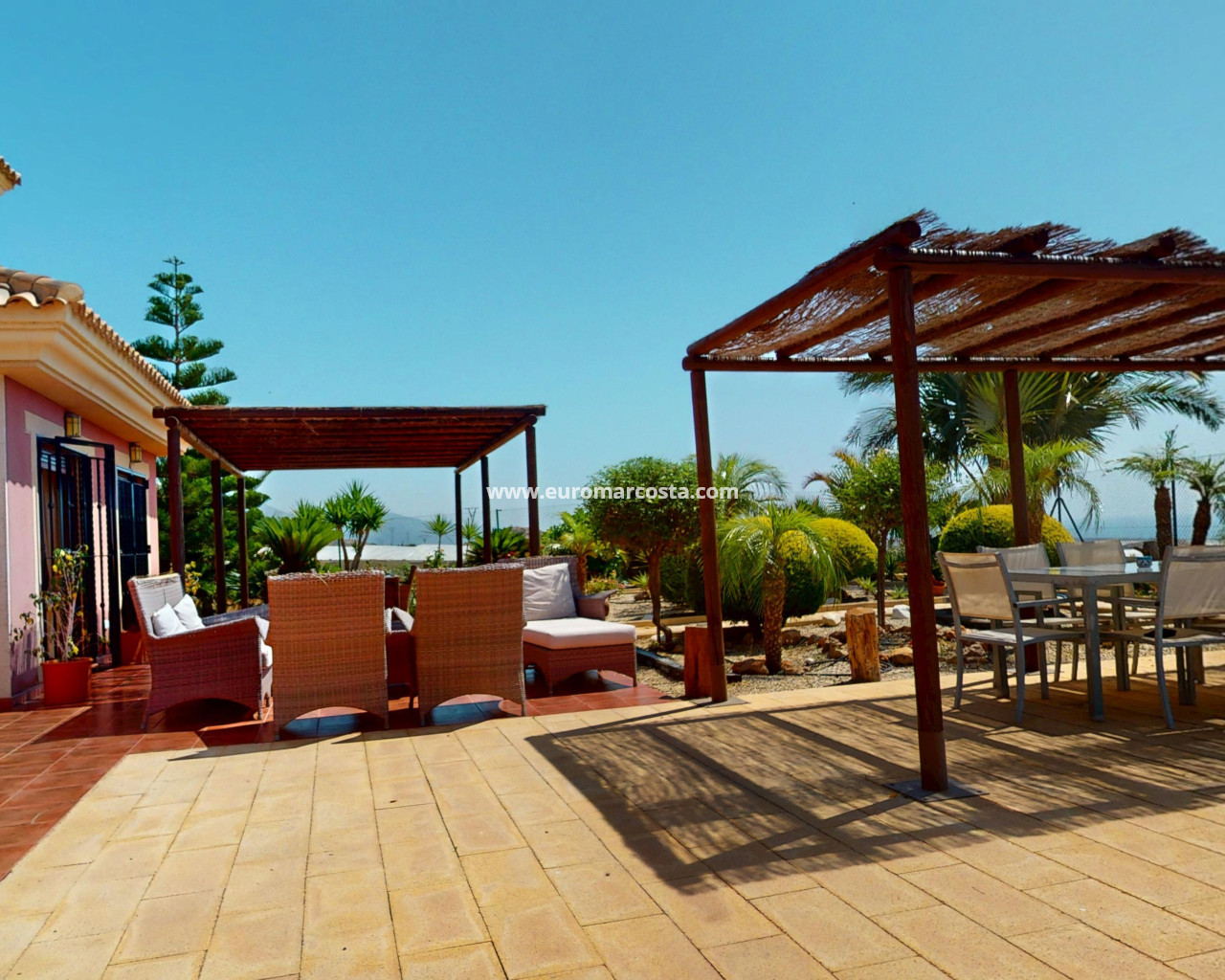 El exterior de este chalet independiente en Águilas está diseñado para maximizar el disfrute del clima mediterráneo. La propiedad cuenta con un hermoso jardín privado, perfecto para relajarse o para que los niños jueguen al aire libre. Además, dispone de una amplia terraza donde se pueden organizar reuniones familiares o simplemente disfrutar de las vistas al mar. Uno de los aspectos más destacados es la piscina privada, que ofrece un oasis de frescura durante los cálidos días de verano. El garaje privado añade comodidad y seguridad, permitiendo un acceso directo a la vivienda.