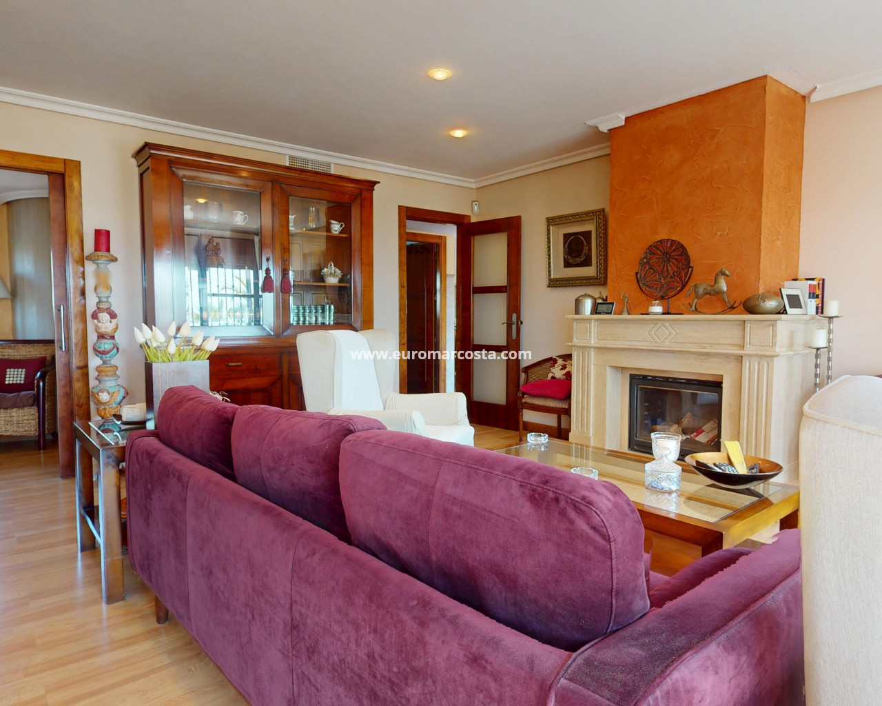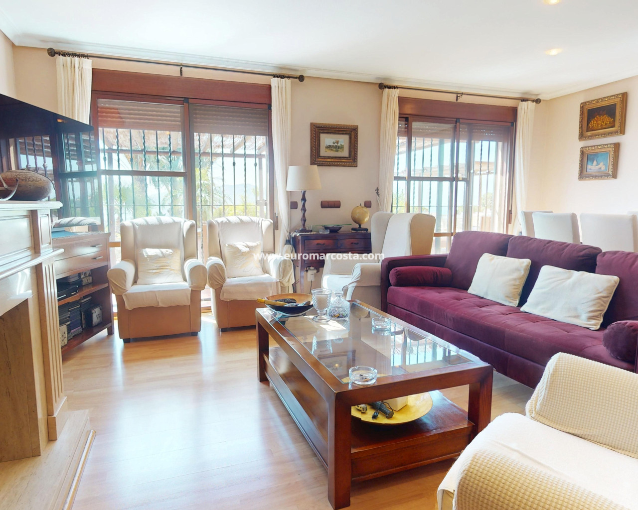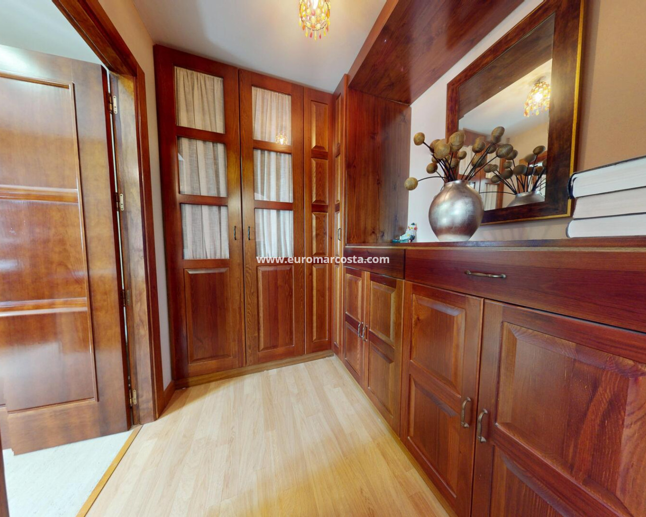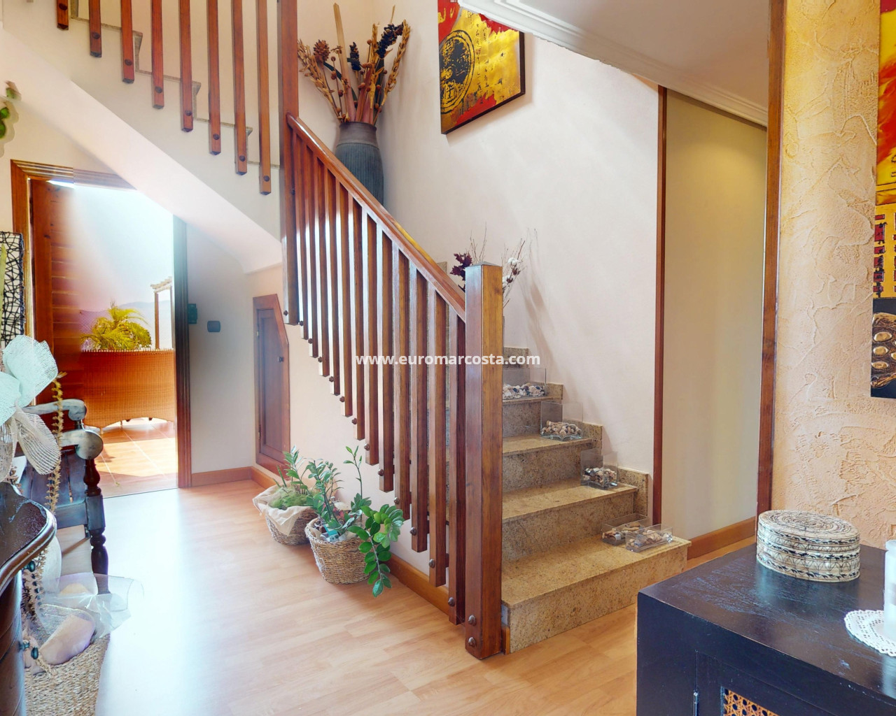 El interior del chalet está cuidadosamente diseñado para ofrecer confort y funcionalidad. La vivienda está completamente amueblada, lo que permite una mudanza sin preocupaciones. Los suelos combinan gres y tarima flotante, proporcionando un ambiente elegante y acogedor. La cocina está equipada con electrodomésticos modernos, facilitando las tareas diarias. El aire acondicionado asegura un ambiente agradable durante todo el año. Los armarios empotrados en los dormitorios ofrecen un amplio espacio de almacenamiento, manteniendo la organización y el orden en el hogar.